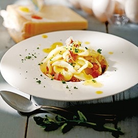 低烹慢煮-6:低溫烹調達人示範篇【培根蛋黃花枝麵 想要變化料理嗎?不用大費周章,只要掌握低溫烹調的精神,替換一下食材,就能端出口感特別、讓人意想不到的培根蛋黃麵,趕緊看看達人的巧思吧